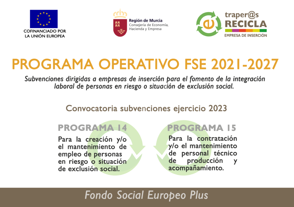 Estas subvenciones, dirigidas a empresas de inserción para el fomento de la integración laboral de personas en riesgo o situación de exclusión social, ayudarán a que durante 2023, en Traperos Recicla sigamos adelante con nuestro proyecto de lucha contra la pobreza y exclusión a través del empleo.