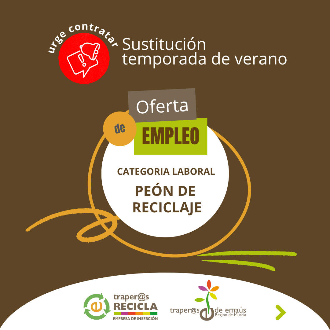 En Traperos Recicla creemos en las segundas oportunidades para las personas y los objetos. Somos una empresa de inserción sociolaboral y ofrecemos oportunidades de empleo en reciclaje en Murcia, fomentando la inserción sociolaboral y la economía circular. Consulta nuestras vacantes o envíanos tu currículum.